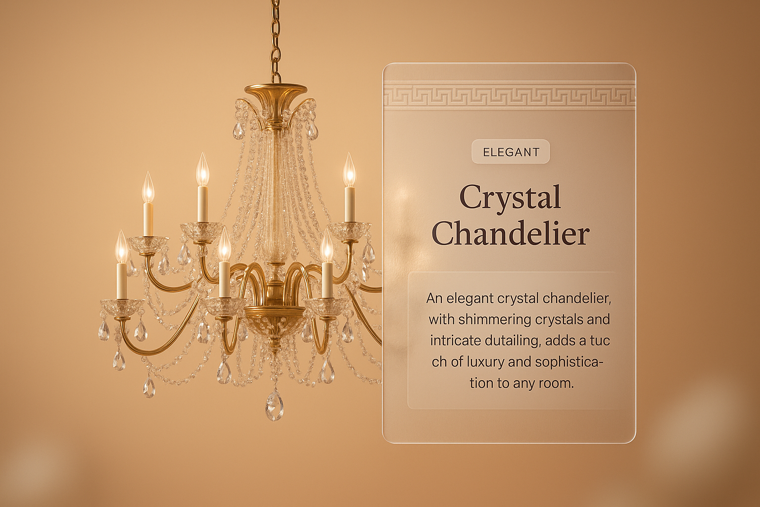 /Collection: /by davooda/Type: PNG/A stunning 3D illustration of a crystal chandelier, featuring shimmering crystals and detailed craftsmanship, set against a smooth gradient background. The design includes a stylish text block with elegant typography.