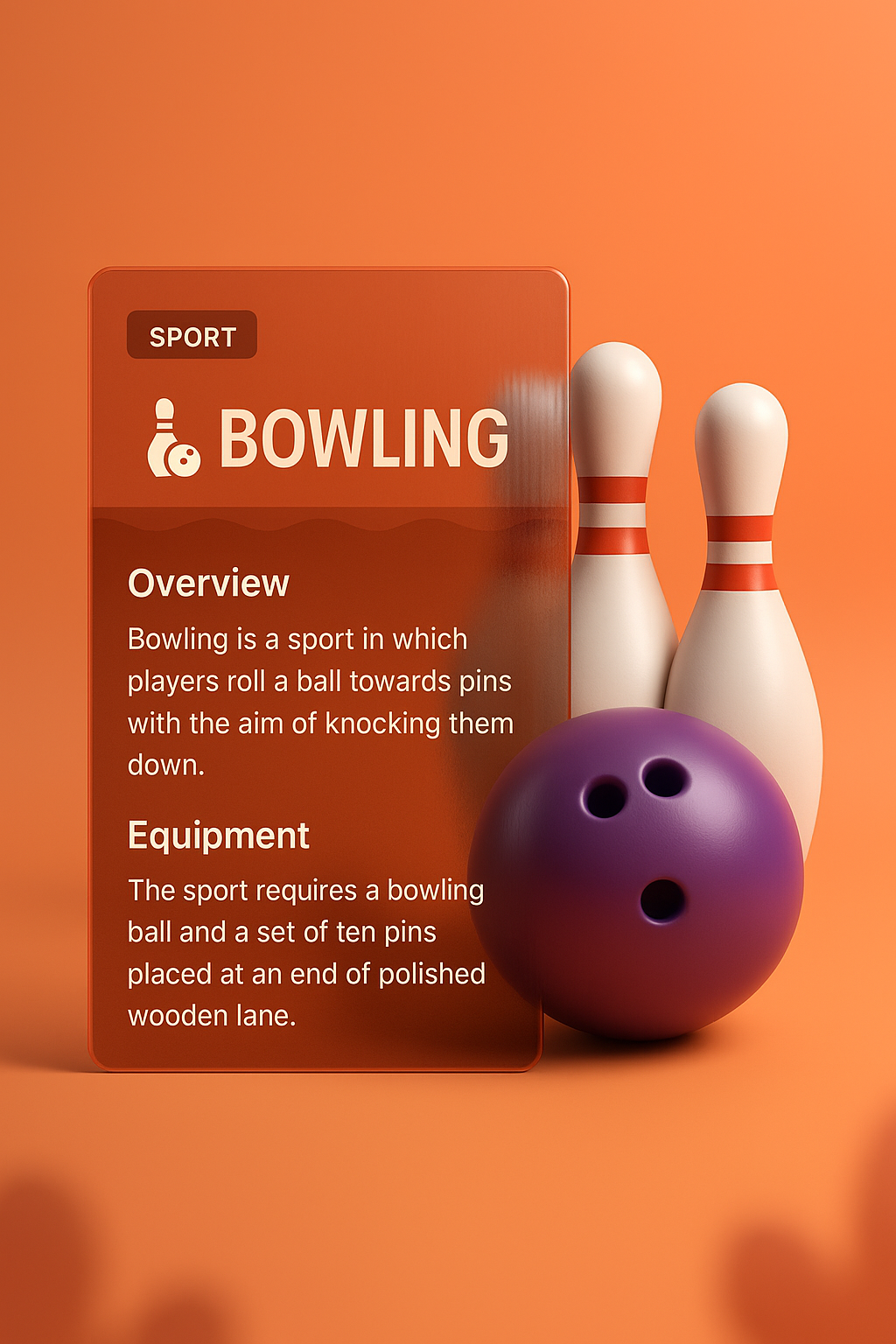A visually appealing 3D bowling interface featuring a purple bowling ball, two bowling pins, and an integrated information card. The design uses a smooth gradient background and a modern aesthetic.