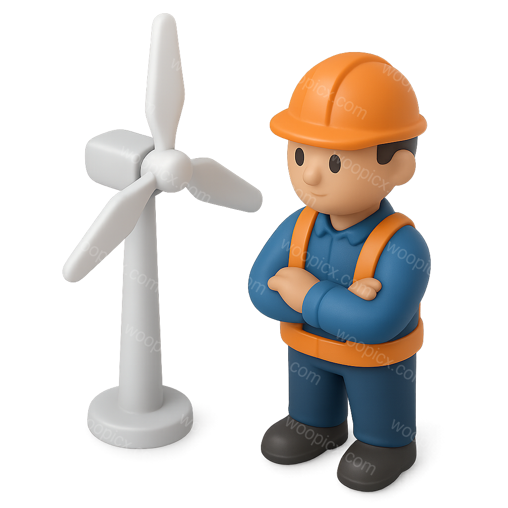A 3D icon depicting a wind turbine technician standing beside a wind turbine. The technician is wearing an orange hard hat and blue overalls, with a friendly expression.