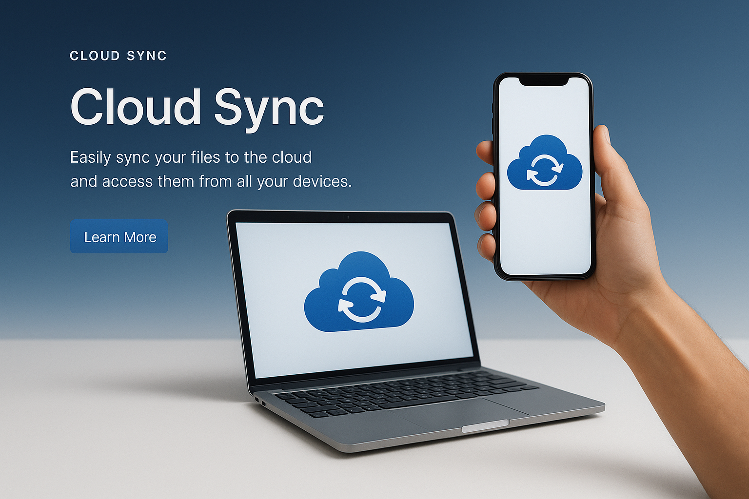 A modern webpage design featuring cloud sync services, showcasing a laptop and smartphone with cloud icons. The background has a gradient from dark blue to white, enhancing readability.