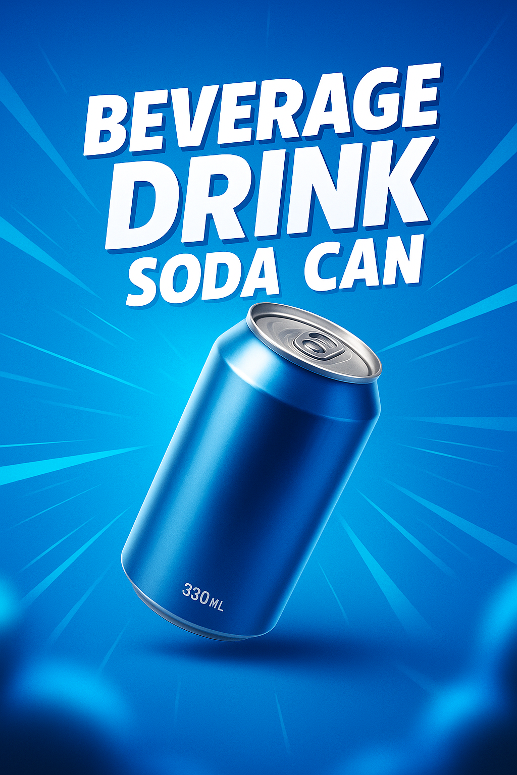 /Collection: /by davooda/Type: PNG/A visually striking 3D illustration of a 330ml aluminum soda can set against a vibrant blue gradient background. The can is tilted dynamically, with bold text emphasizing its features.