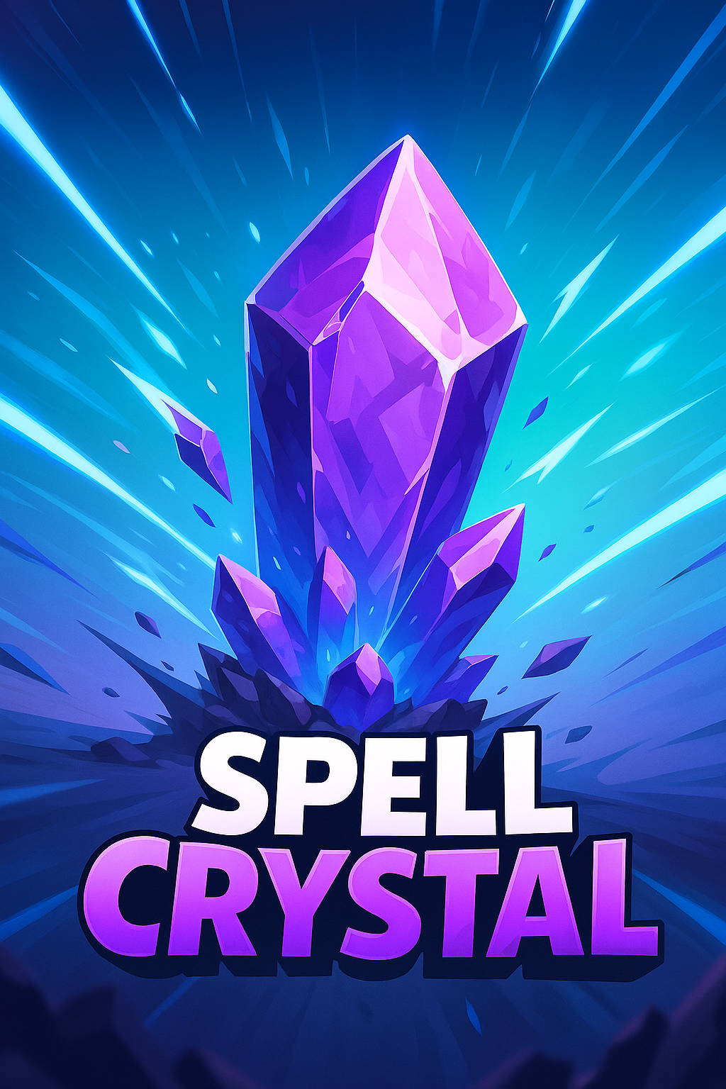 /Collection: /by davooda/Type: PNG/A striking 3D illustration of a purple spell crystal, radiating dynamic light rays and set against a smooth blue gradient background. The title 'SPELL CRYSTAL' features bold typography, enhancing the visual impact.