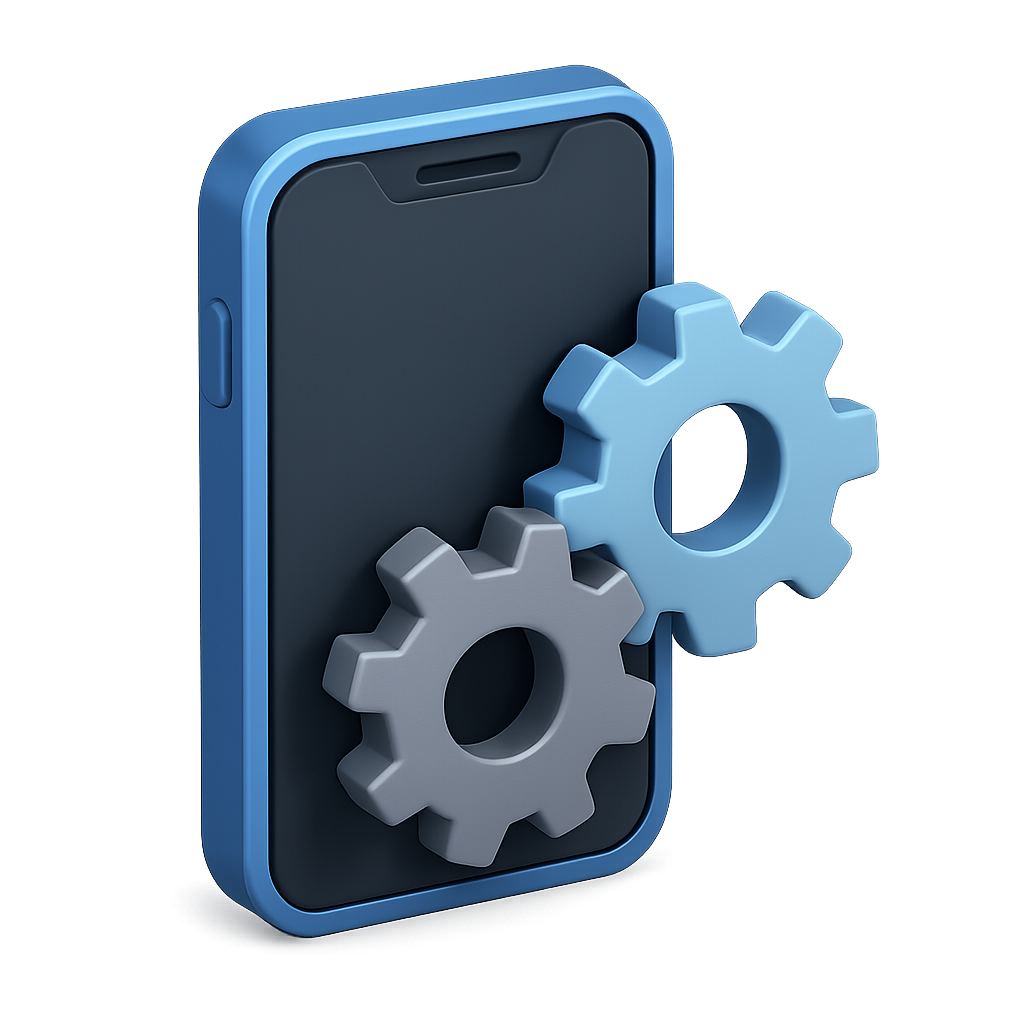 A visually appealing 3D icon of a smartphone featuring two gears, designed in a three-quarter view with a transparent background. The colors are a blend of blue and gray, giving a modern tech feel.