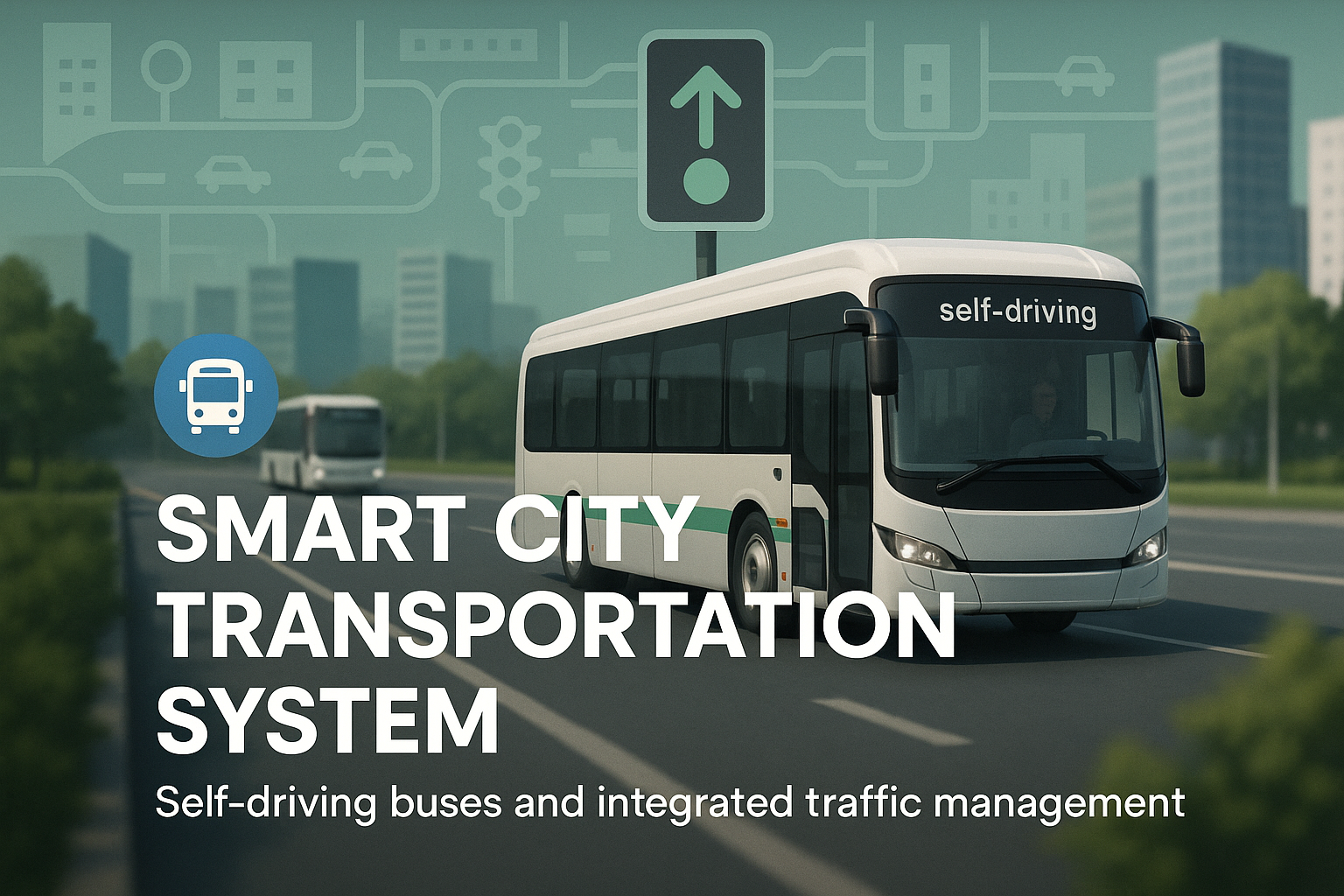 /Collection: /by davooda/Type: PNG/Illustrative image depicting self-driving buses in a smart city environment, showcasing modern transportation solutions and advanced traffic management systems, ideal for urban planning discussions.