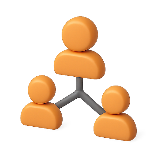3D stylized icon representing network connections among individuals, featuring orange figures connected by gray lines. Ideal for digital communication or teamwork themes.