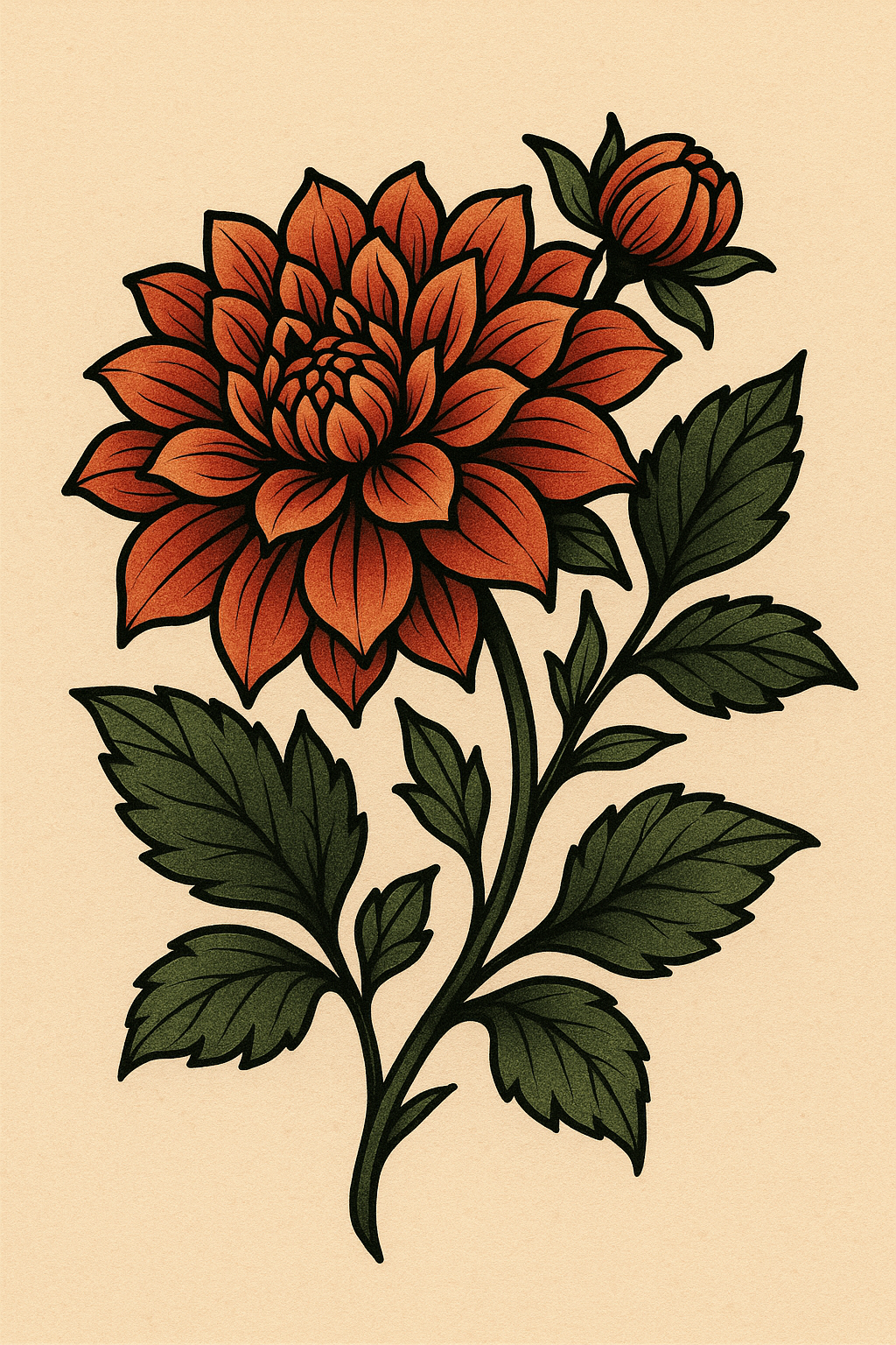 This image features a stylized illustration of a large flower with intricate details and green leaves, ideal for botanical art or design inspiration.