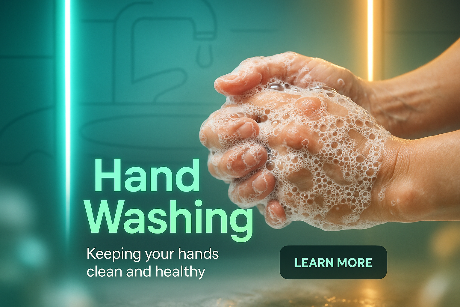 Engaging graphic promoting hand washing with vibrant colors and a clean design, ideal for health campaigns and educational materials.