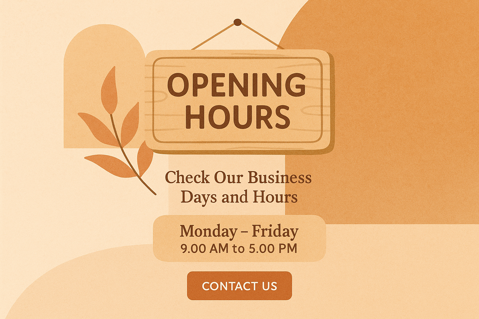 A visually appealing boho-style opening hours board featuring a wooden sign. The design includes soft gradient colors and clear text displaying business days and hours.