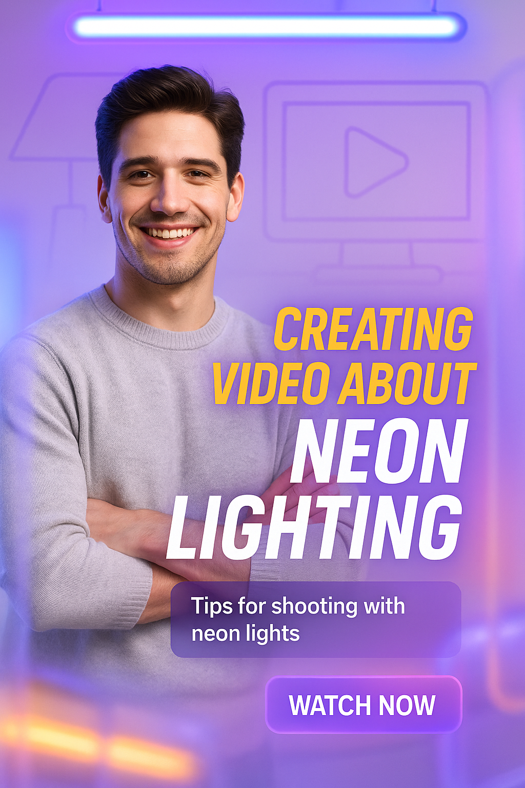 Vibrant social media post featuring a smiling individual in a modern setting, promoting tips for video creation about neon lighting. Ideal for video production or photography audiences.