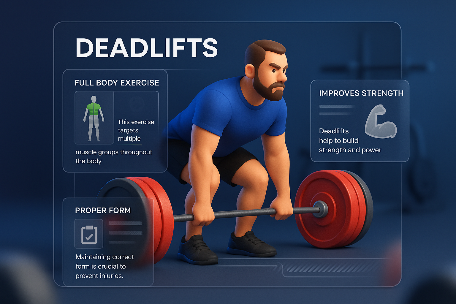 3D Illustration of Deadlifts Exercise with Informative Overlay