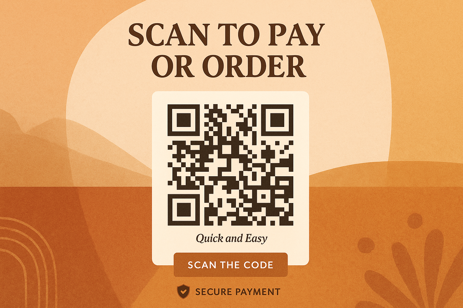 A visually appealing boho-style poster featuring a QR code for scanning to pay or order. The warm color palette and layered design elements create a professional yet inviting aesthetic.