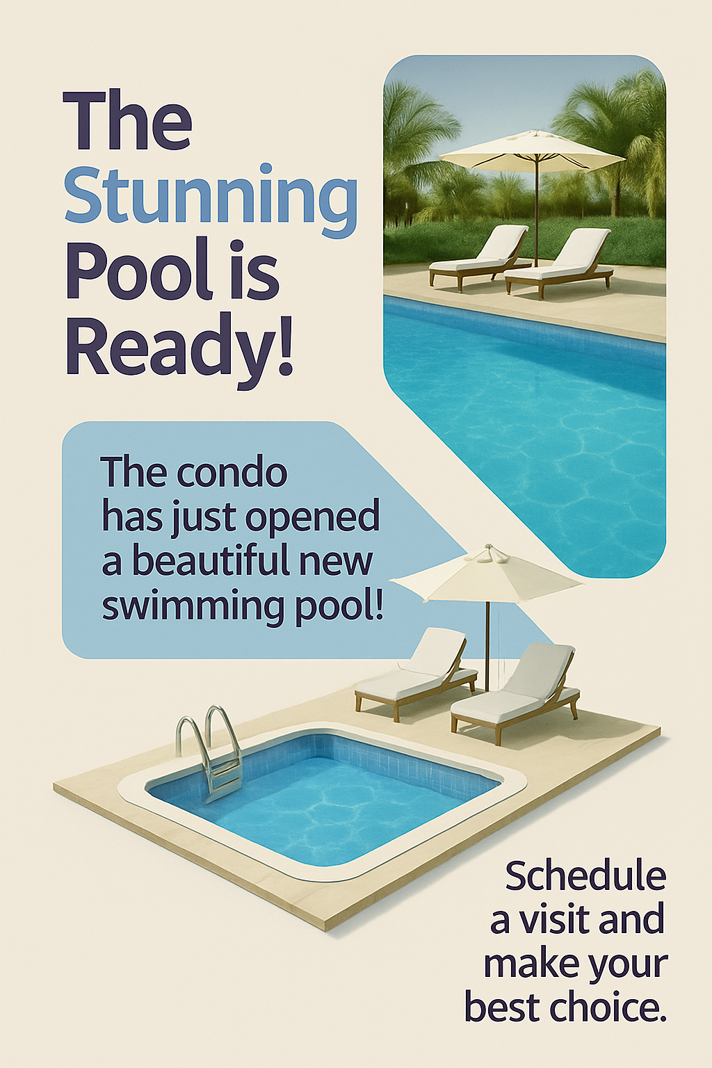 Vibrant promotional graphic showcasing a new swimming pool at a condo, featuring inviting imagery and engaging layout suitable for real estate marketing.