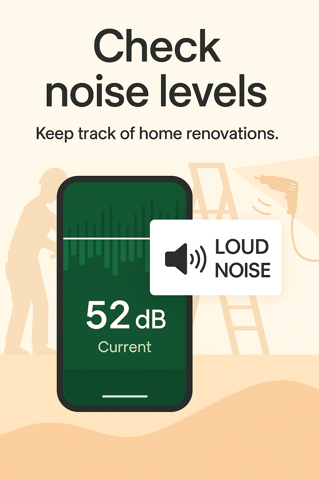 /Collection: /by davooda/Type: PNG/Visual representation of a mobile app interface designed to track noise levels, featuring a current dB reading and a background of home renovation activities. Ideal for home improvement and renovation contexts.