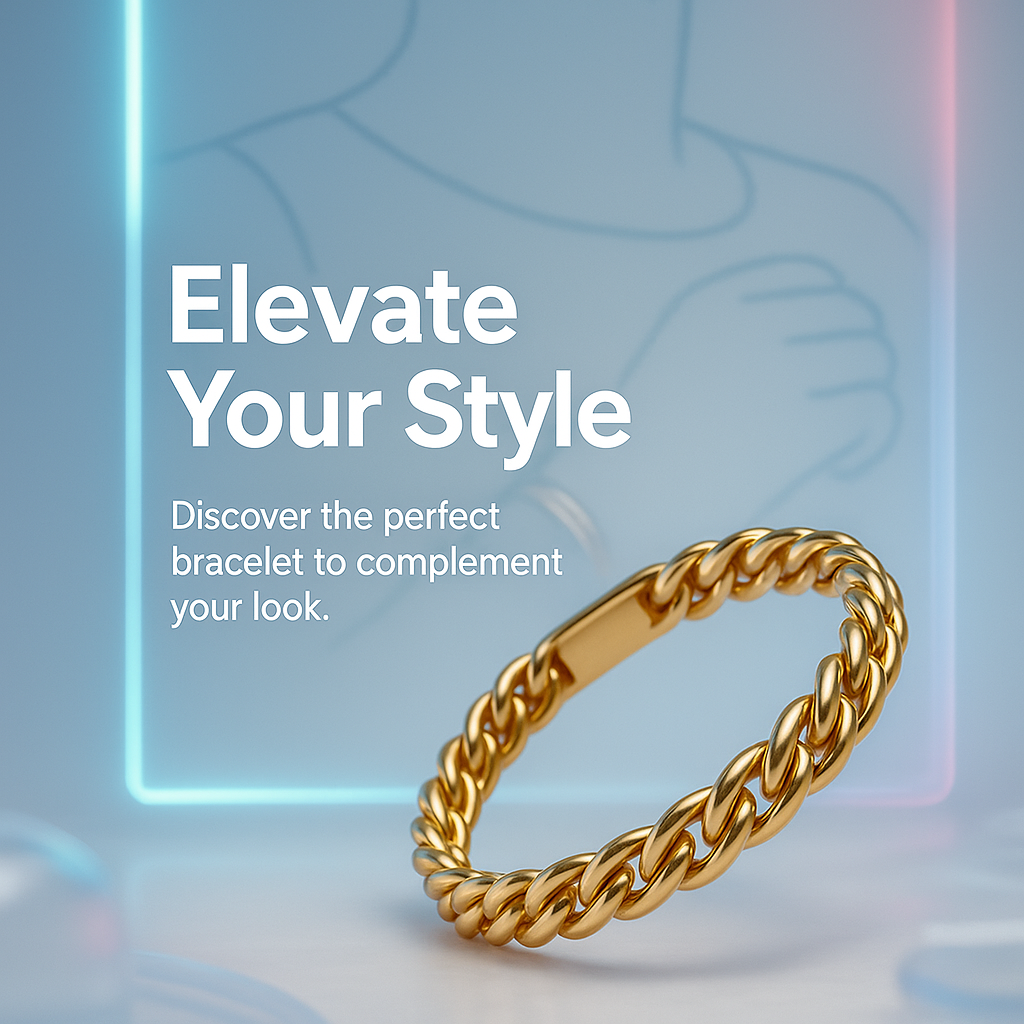 Stylish promotional image showcasing a gold bracelet against a modern, minimalist background. Ideal for social media marketing in the fashion and jewelry sector.