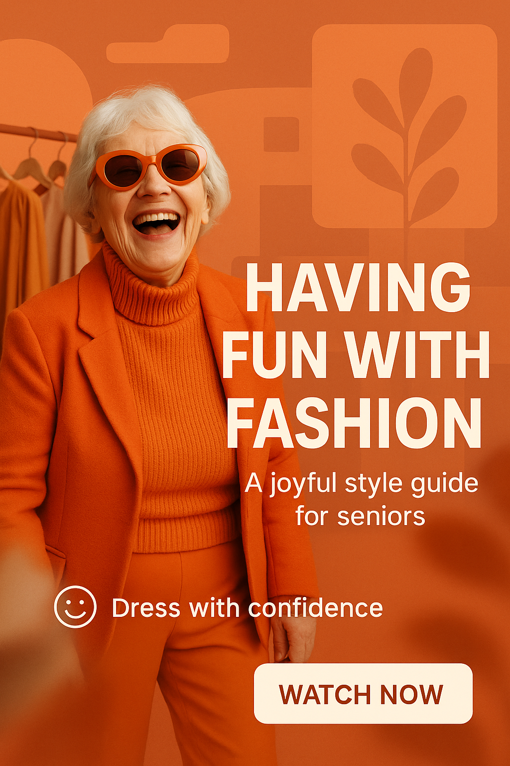 Vibrant promotional graphic for a fashion guide aimed at seniors, featuring a cheerful older woman in stylish attire. The design is warm and inviting, perfect for social media marketing.