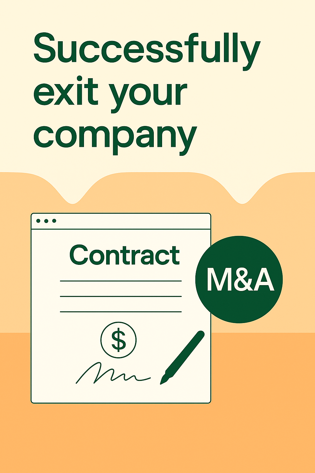 /Collection: /by davooda/Type: PNG/Informative graphic illustrating a business exit strategy featuring a contract and M&A elements. Suitable for advisory services and corporate communications.