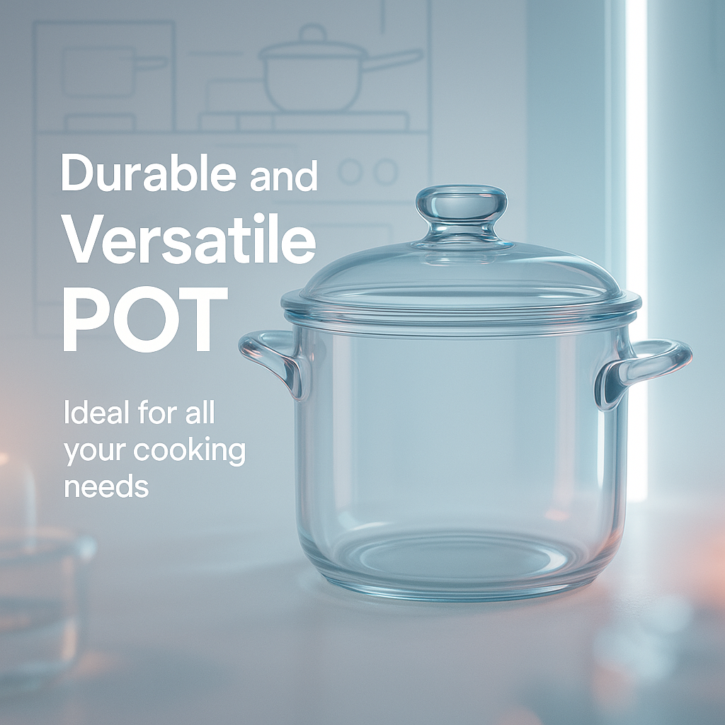 Sleek and modern image of a transparent glass pot, showcasing its durability and versatility. Ideal for kitchenware promotions and product showcases.