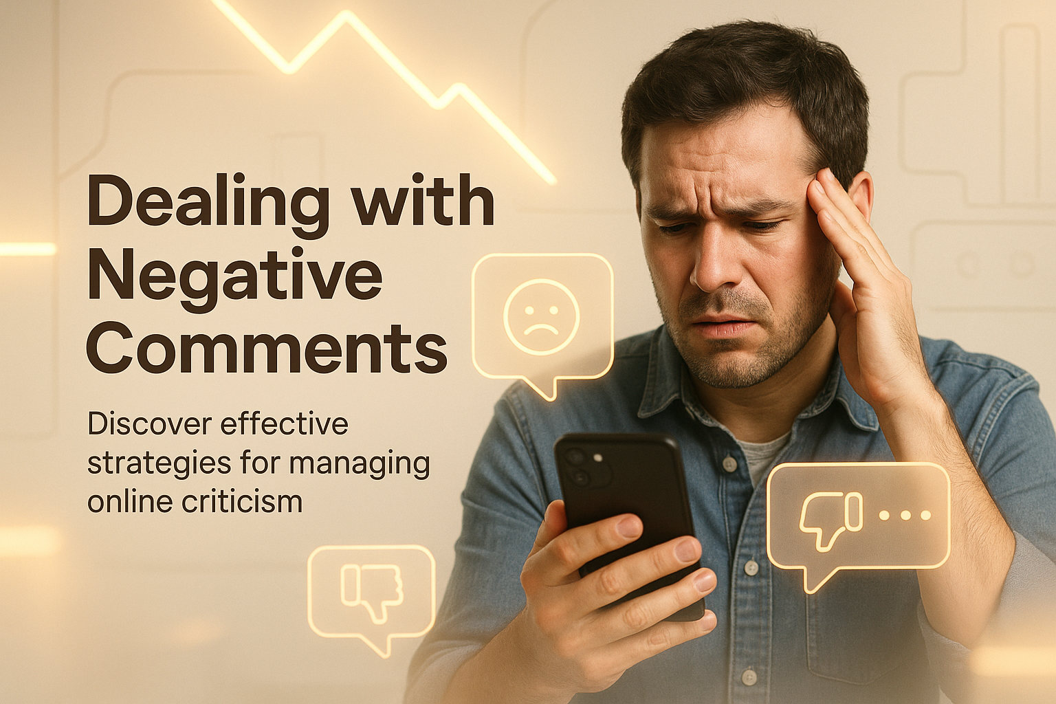 Informative graphic illustrating strategies for dealing with negative online comments, featuring a concerned individual interacting with a smartphone. Ideal for mental health or social media management resources.