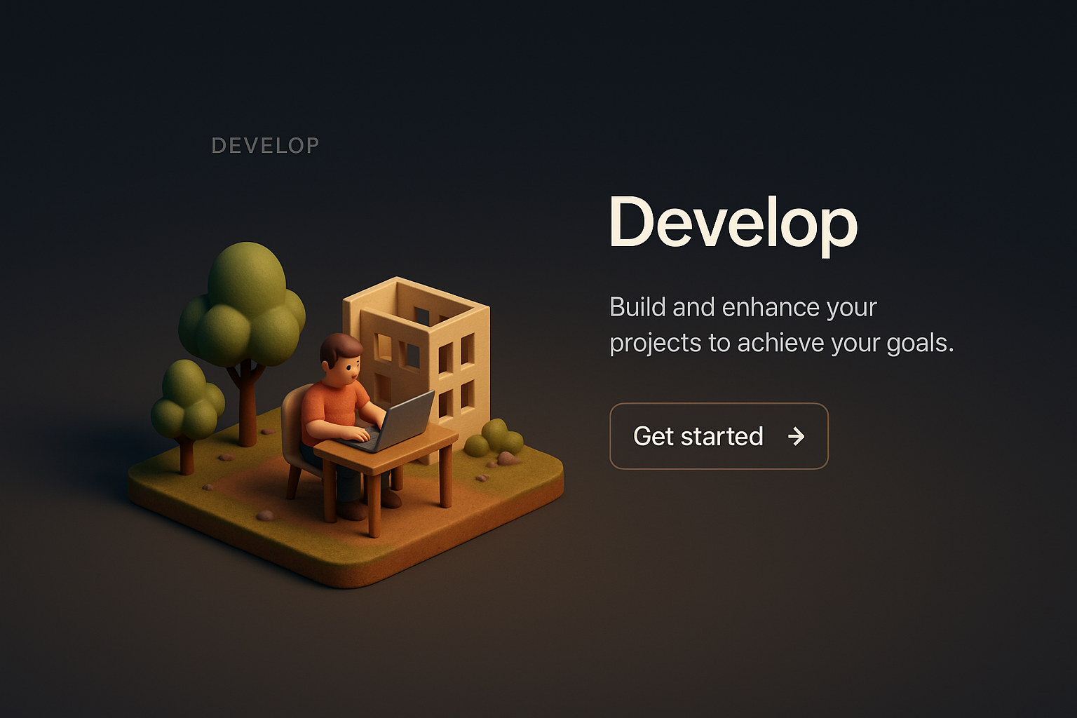 /Collection: /by davooda/Type: PNG/A zoomed-out 3D scene showing a person working on a laptop in a small environment with trees and a building. The dark gradient background enhances the focus on the content.