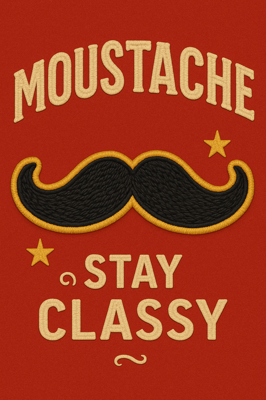 Playful graphic design showcasing an embroidered moustache with the phrase 'Stay Classy'. Ideal for casual apparel or novelty items targeting humor enthusiasts.