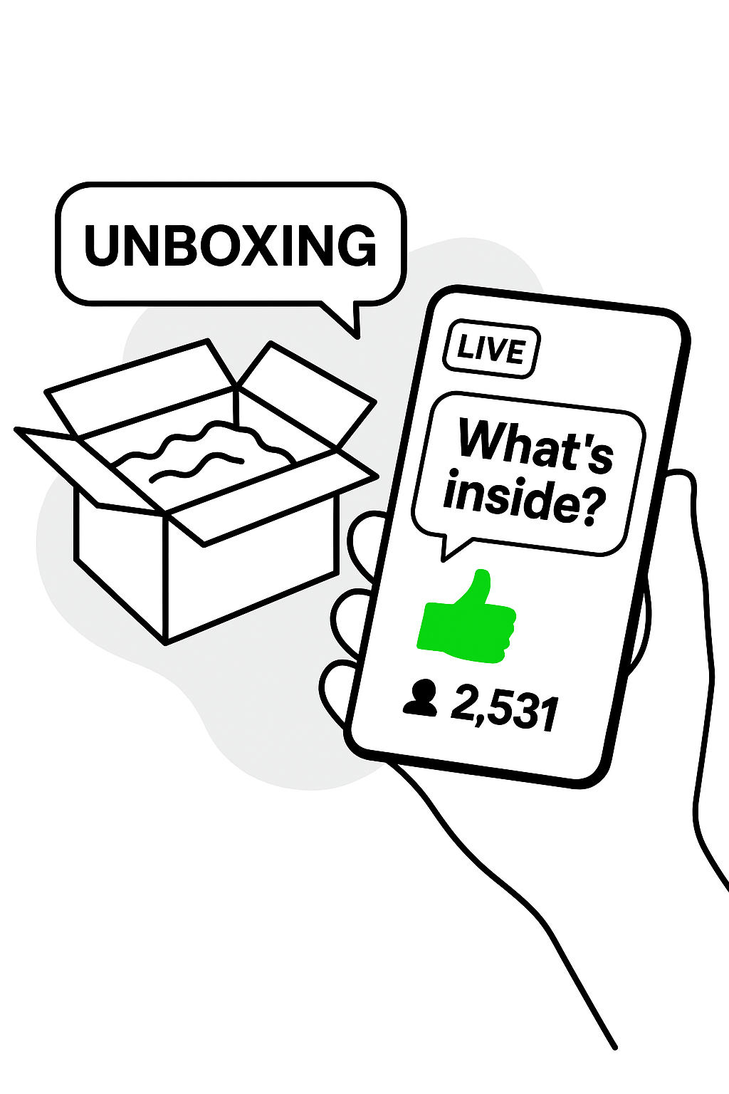 /Collection: /by davooda/Type: PNG/Illustrative graphic depicting a hand holding a smartphone displaying a live unboxing event, featuring a speech bubble and a box, ideal for social media engagement.