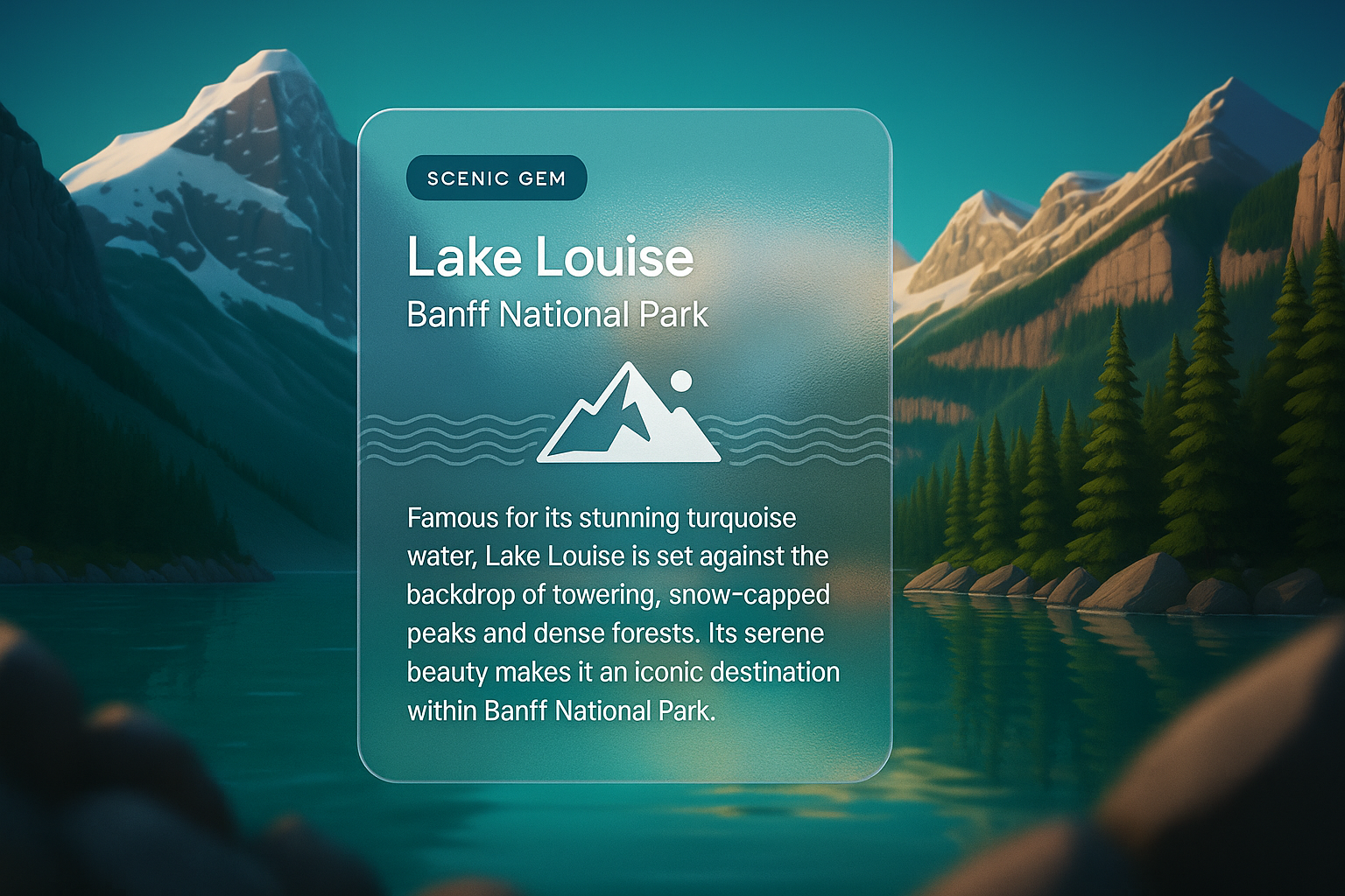 A serene 3D illustration of Lake Louise in Banff National Park featuring turquoise waters and snow-capped peaks. The design includes text blocks and layered elements for a cohesive web layout.