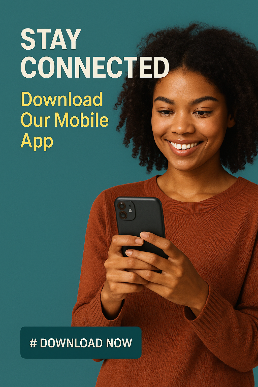 A promotional graphic showcasing a young woman engaging with a mobile app, designed to encourage app downloads with a modern, inviting aesthetic.