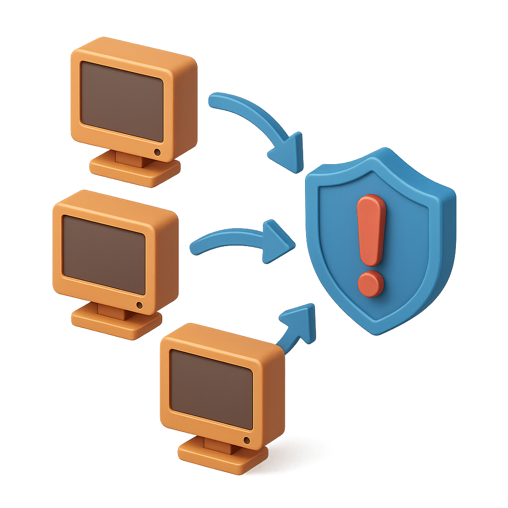 A visually striking 3D isometric design featuring three computer monitors and a shield, symbolizing DDoS protection. The monitors are orange, while the shield is blue with an exclamation mark.