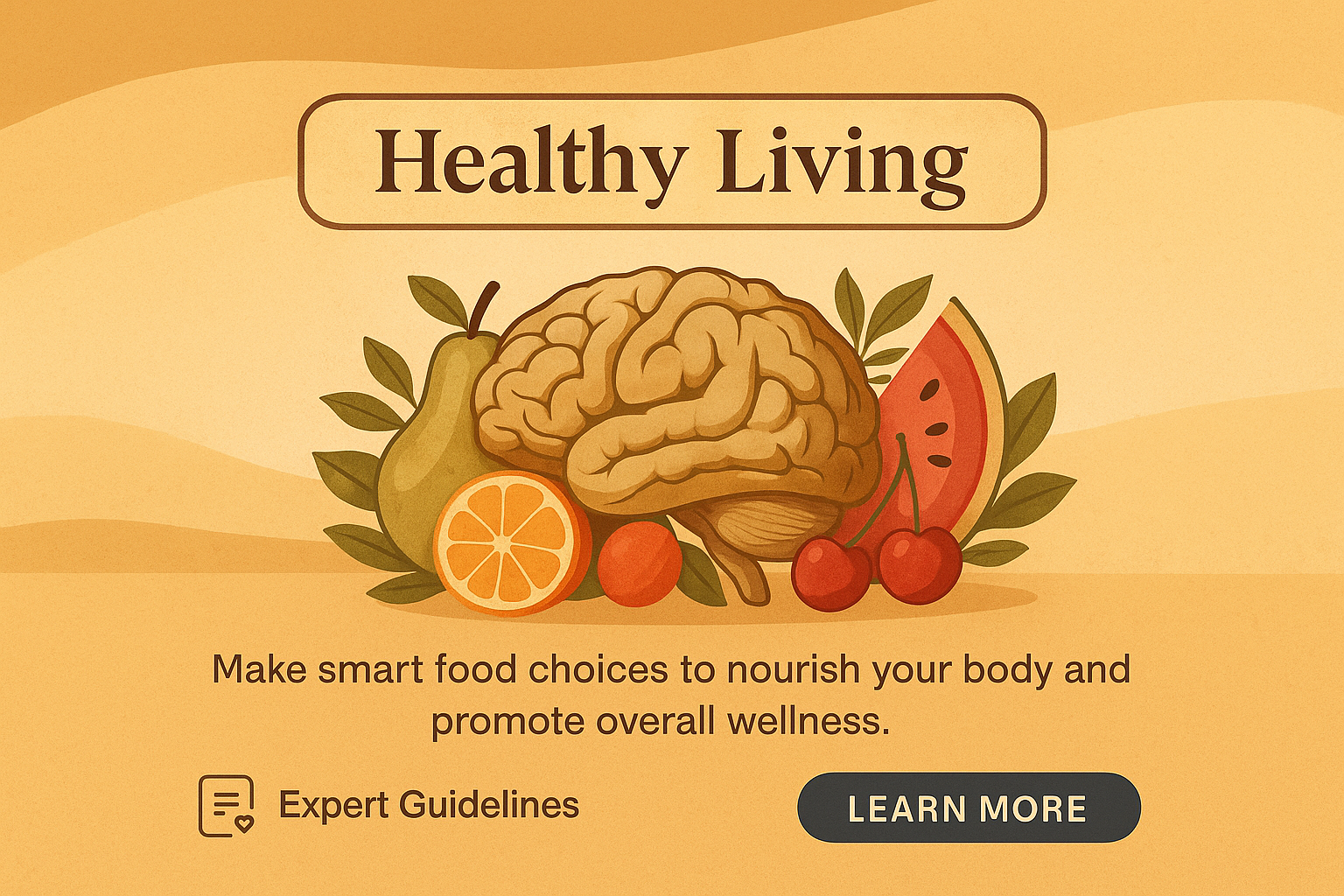/Collection: /by davooda/Type: PNG/An artistic representation of a brain surrounded by various fruits, symbolizing healthy eating and living. The design includes a soft gradient background and engaging text elements.