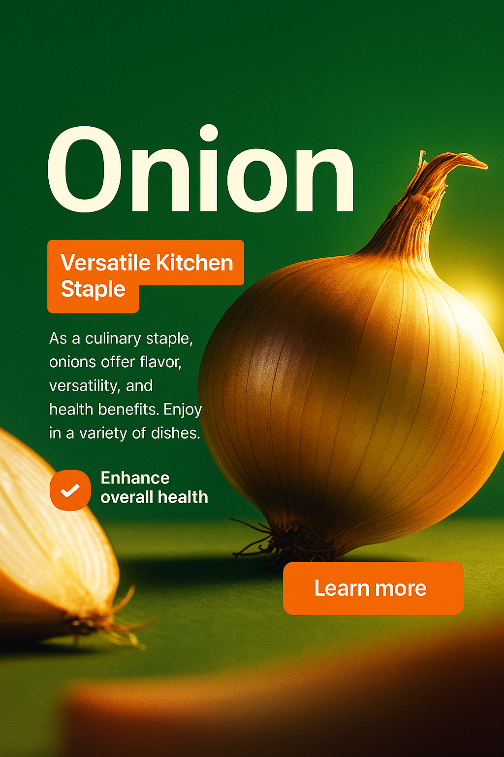 A realistic portrayal of an onion, enhanced with dramatic lighting and a vibrant background, showcasing its culinary importance and health benefits.