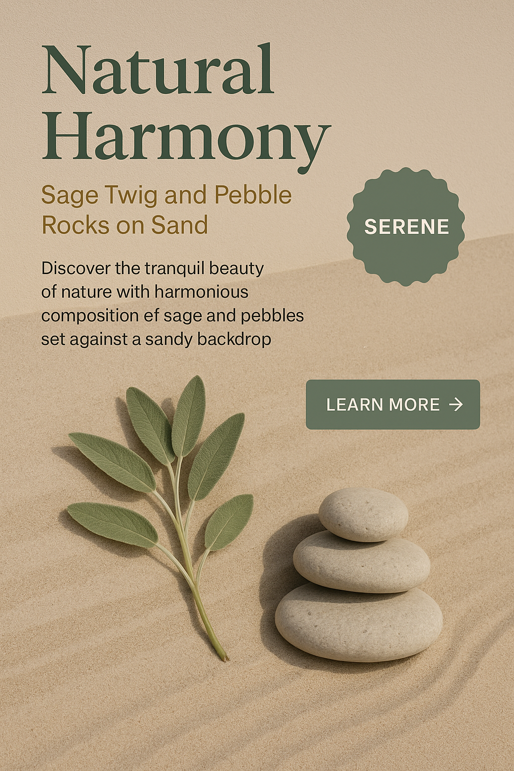 /Collection: /by davooda/Type: PNG/A serene composition featuring a sage twig and smooth pebble rocks on a sandy surface, creating a calming botanical atmosphere. The design includes a gentle color palette and engaging text elements.