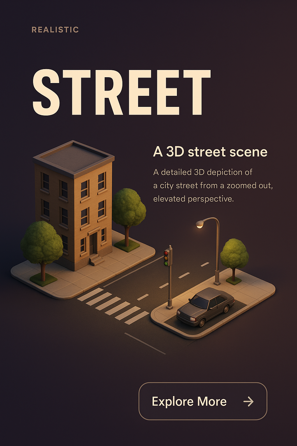 A detailed 3D depiction of a city street from an elevated perspective, showcasing a building, streetlights, and trees in a realistic style.