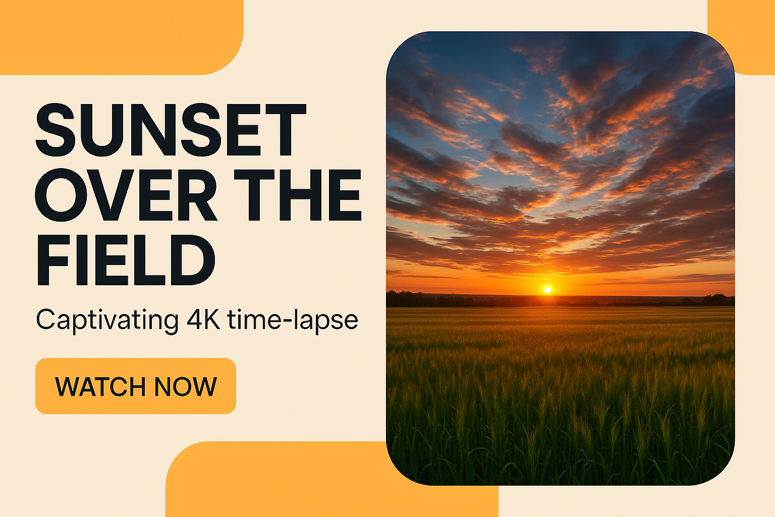 A stunning sunset over a field captured in a captivating 4K time-lapse, featuring vibrant colors and rolling clouds, with a modern corporate layout.