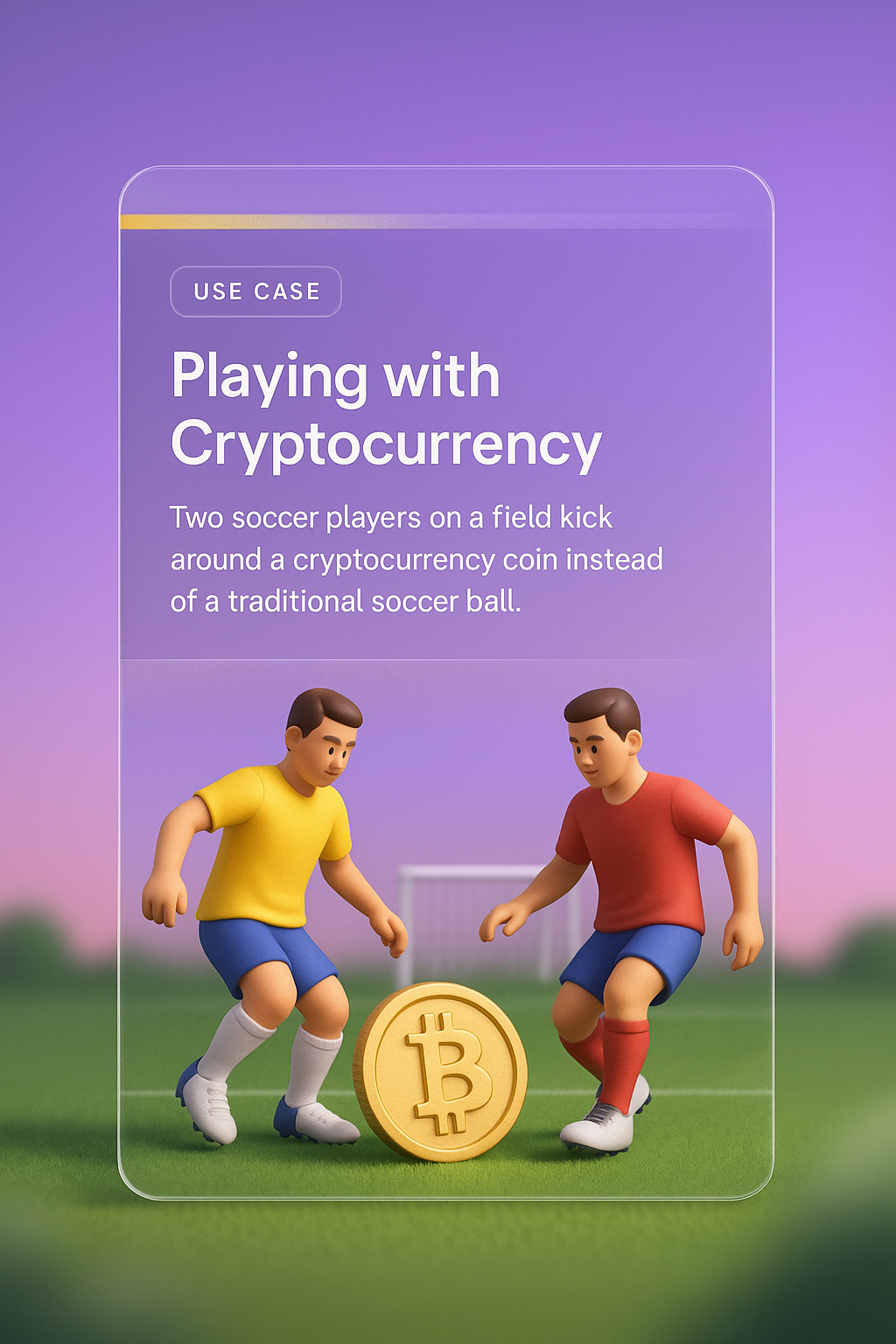 A vibrant 3D illustration showing two soccer players on a field kicking a cryptocurrency coin instead of a traditional ball, set against a smooth gradient background.