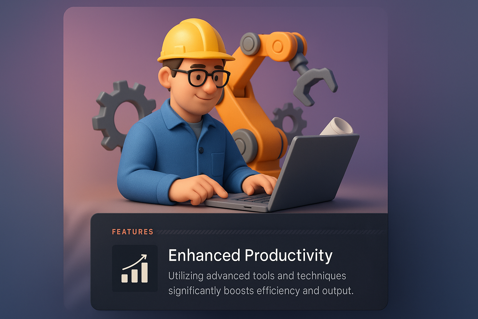/Collection: /by davooda/Type: PNG/A 3D illustration featuring an engineer working on a laptop, highlighting productivity through advanced tools. The background transitions smoothly with subtle gear elements.