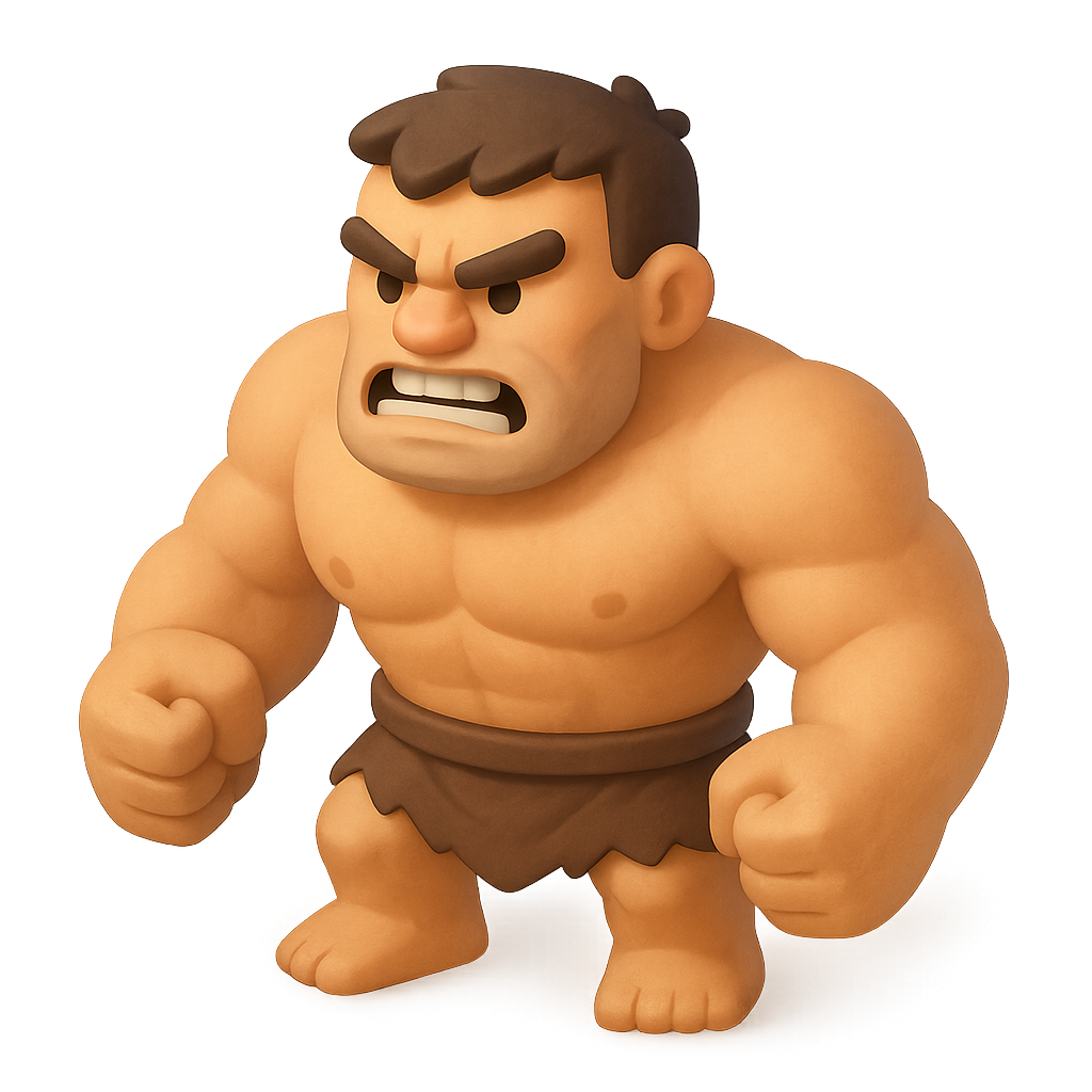 A stylized 3D brute character with a muscular build, depicted in a three-quarter view. The figure has an angry expression, wearing a simple brown loincloth against a soft gradient background.