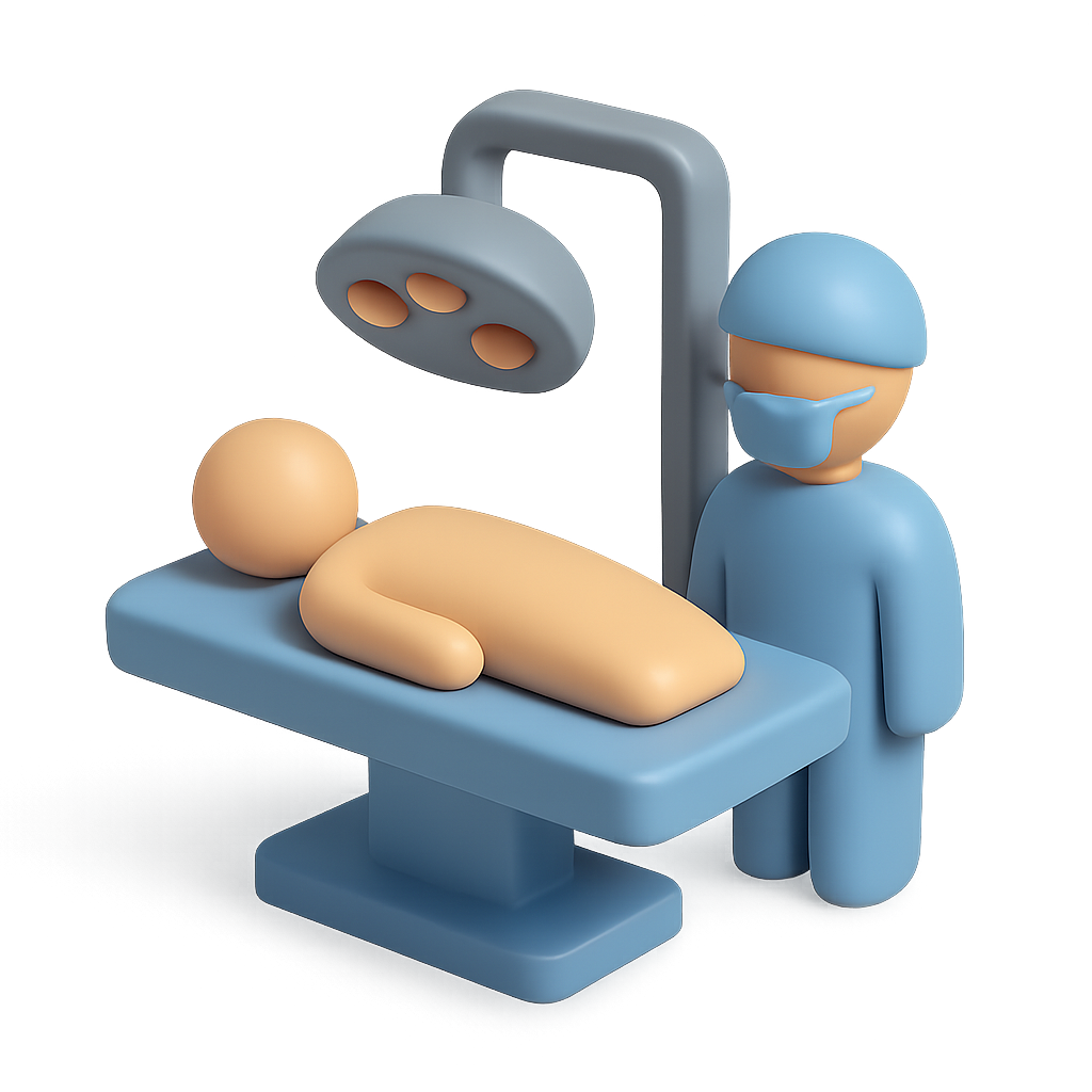 A stylized 3D icon representing a surgical scene, featuring a surgeon beside a patient on an operating table. The design has a transparent background with a volumetric and isometric perspective.