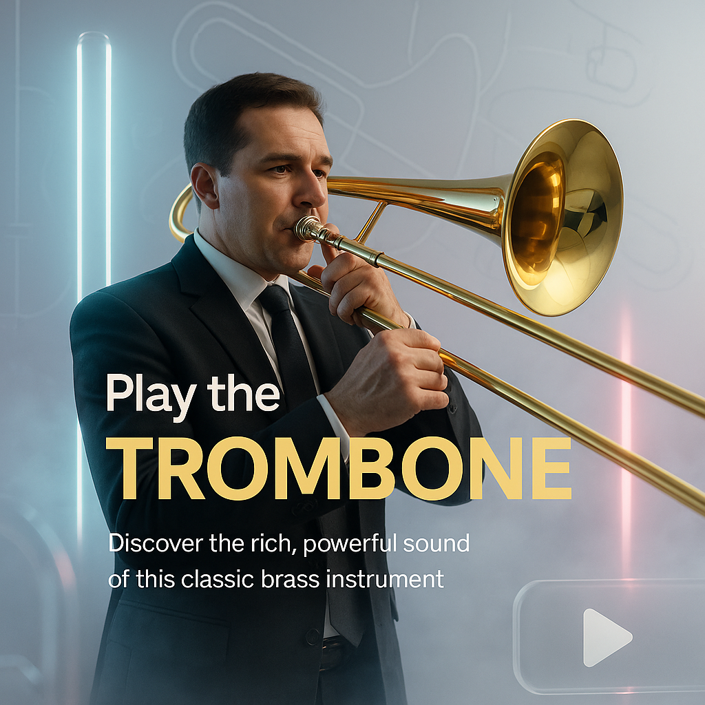 Engaging promotional graphic showcasing a musician playing the trombone, highlighting the instrument's sound and appeal. Ideal for music education or instrument sales.
