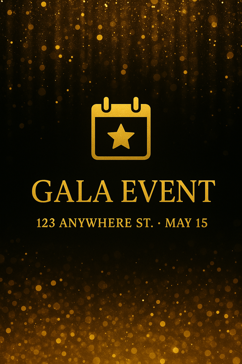 Stylish invitation graphic for a gala event featuring a luxurious gold and black color scheme, suitable for formal gatherings and celebrations.
