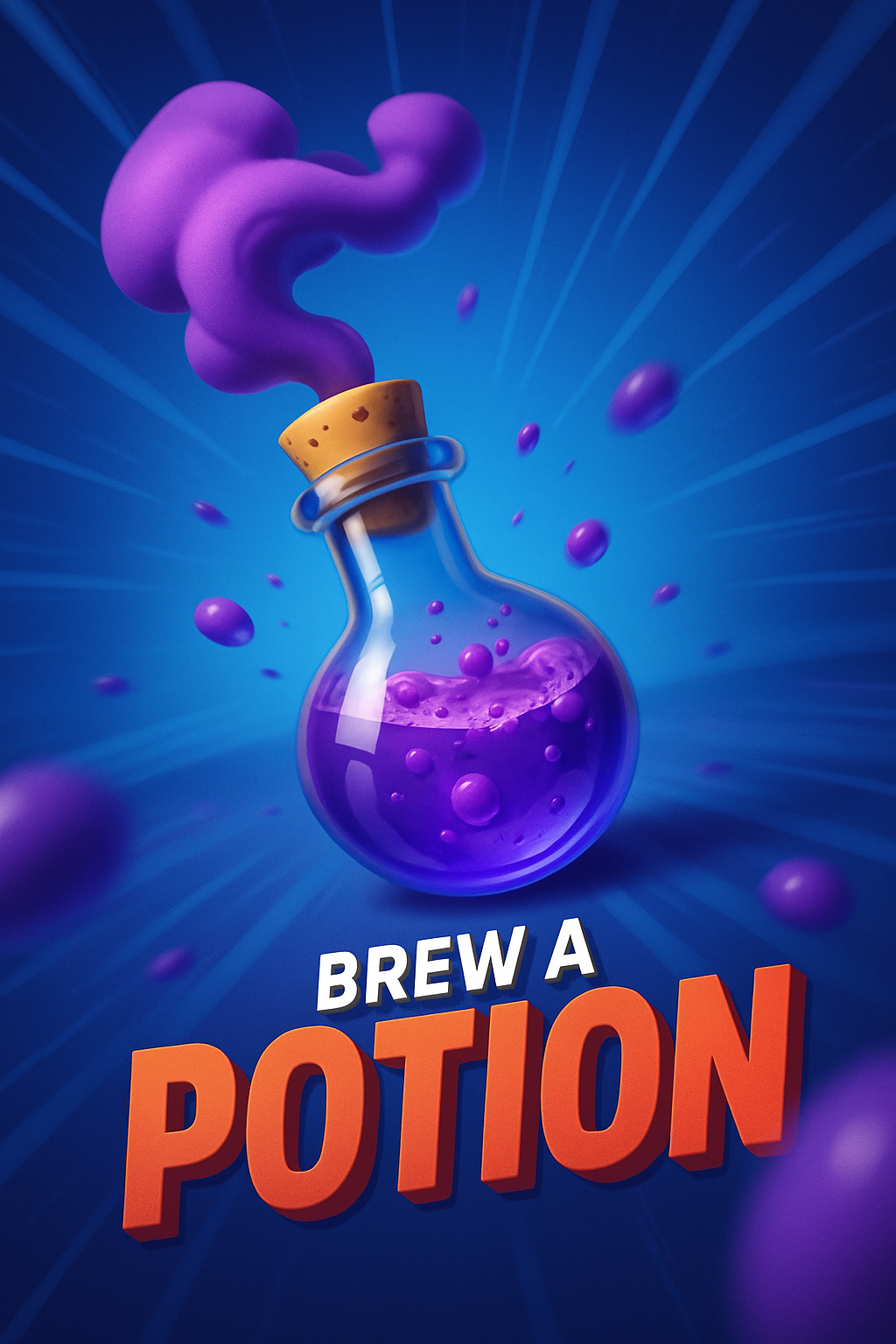 A vibrant illustration of a potion in a glass bottle, emitting purple smoke. The title 'BREW A POTION' is prominently displayed in bold, engaging typography, set against a dynamic blue background.