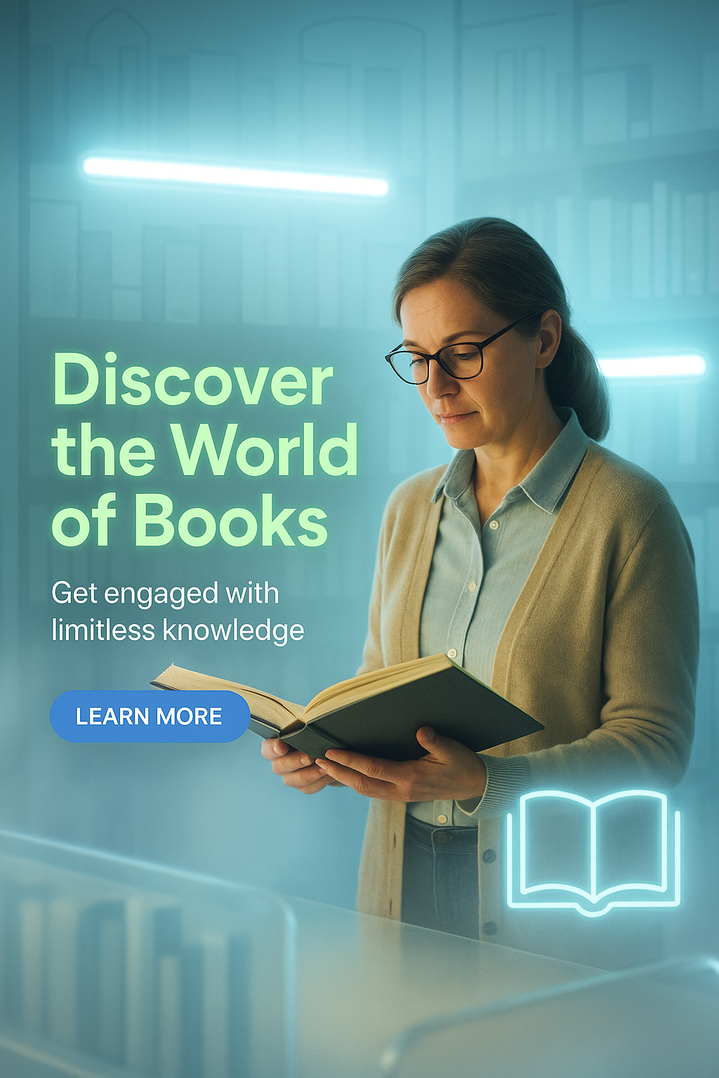 /Collection: /by davooda/Type: PNG/A visually appealing promotional graphic encouraging exploration of books, featuring a woman reading in a modern library setting, ideal for educational or literacy campaigns.