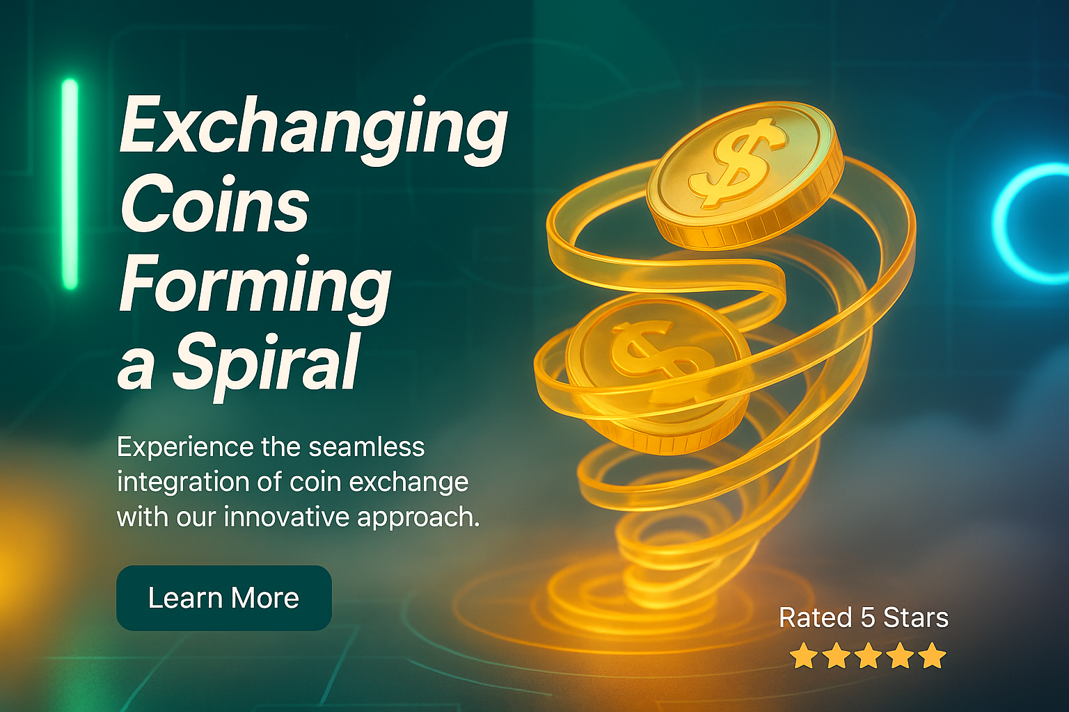 A modern digital graphic illustrating coins forming a spiral, representing innovative coin exchange. Ideal for fintech marketing and promotional materials.