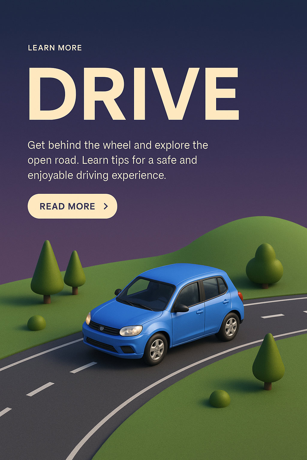 /Collection: /by davooda/Type: PNG/A captivating 3D illustration showcasing a blue car on a winding road, set against a smooth gradient background. The scene integrates realistic elements with a focus on driving.