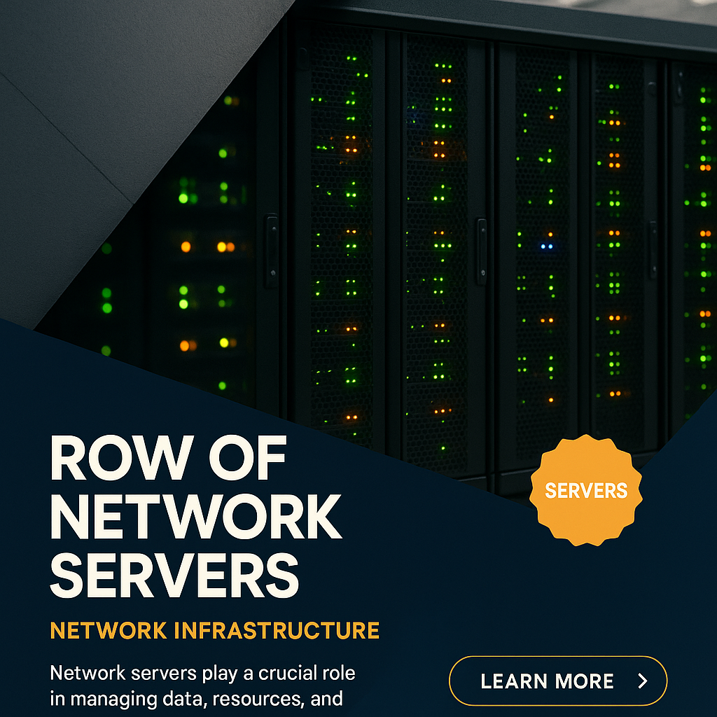/Collection: /by davooda/Type: PNG/A visually striking image of a row of network servers with glowing LED lights, showcasing a modern data center environment. The composition features a layered design with geometric elements and a professional aesthetic.