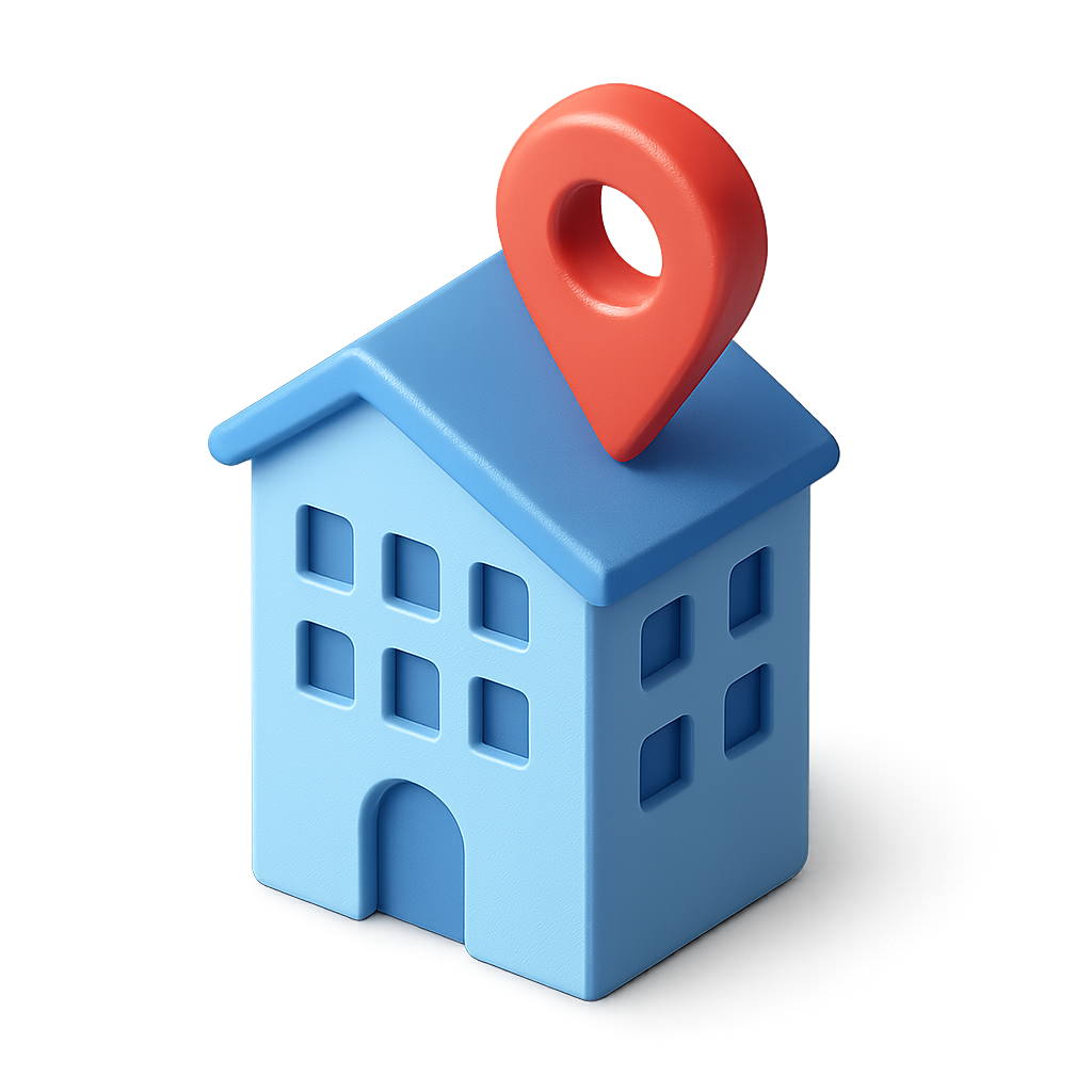 A vibrant blue building icon featuring a prominent red location marker, designed in a 3D isometric style. The transparent background highlights the icon's volumetric effect.