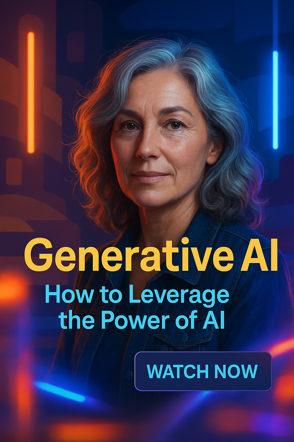 Engaging promotional graphic featuring a woman with silver hair, highlighting a webinar on leveraging AI. Modern design elements and vibrant colors attract attention for digital marketing.