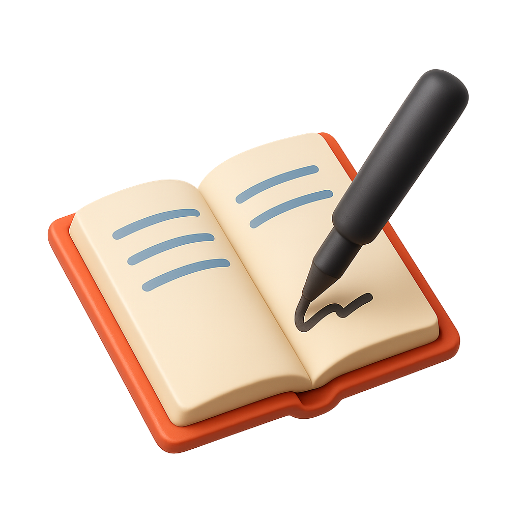 A 3D representation of an open book and a pen, designed with a transparent background. The icon showcases a three-quarter view, emphasizing its volumetric and isometric qualities.