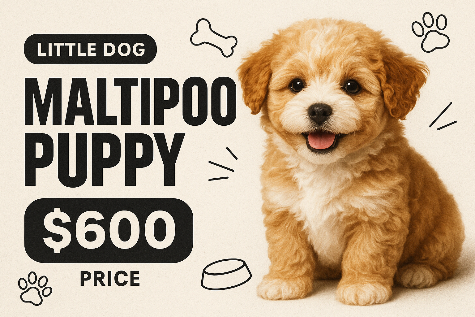 /Collection: /by davooda/Type: PNG/A charming Maltipoo puppy sits against a light textured background, showcasing its fluffy fur. Accompanied by bold typography, the ad features a price tag and playful paw prints.