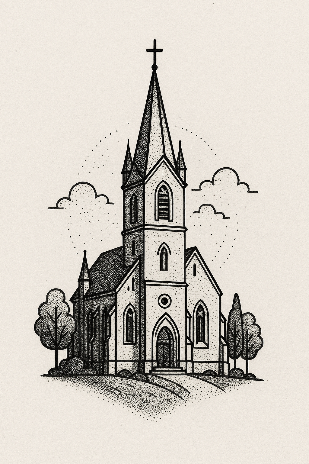A minimalist black and white illustration of a church, featuring detailed line work and a serene landscape. Ideal for art prints or religious-themed designs.