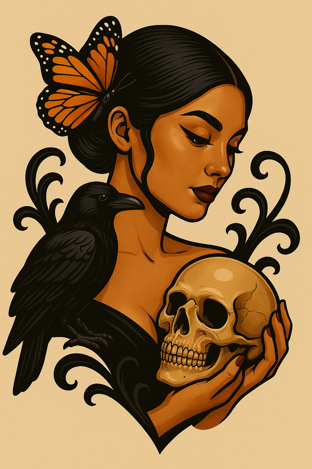 /Collection: /by davooda/Type: PNG/A striking tattoo design showcasing a woman holding a skull, accompanied by a raven on her shoulder. The artwork features glossy finishes and a soft beige background, embodying a classic yet modern tattoo style.